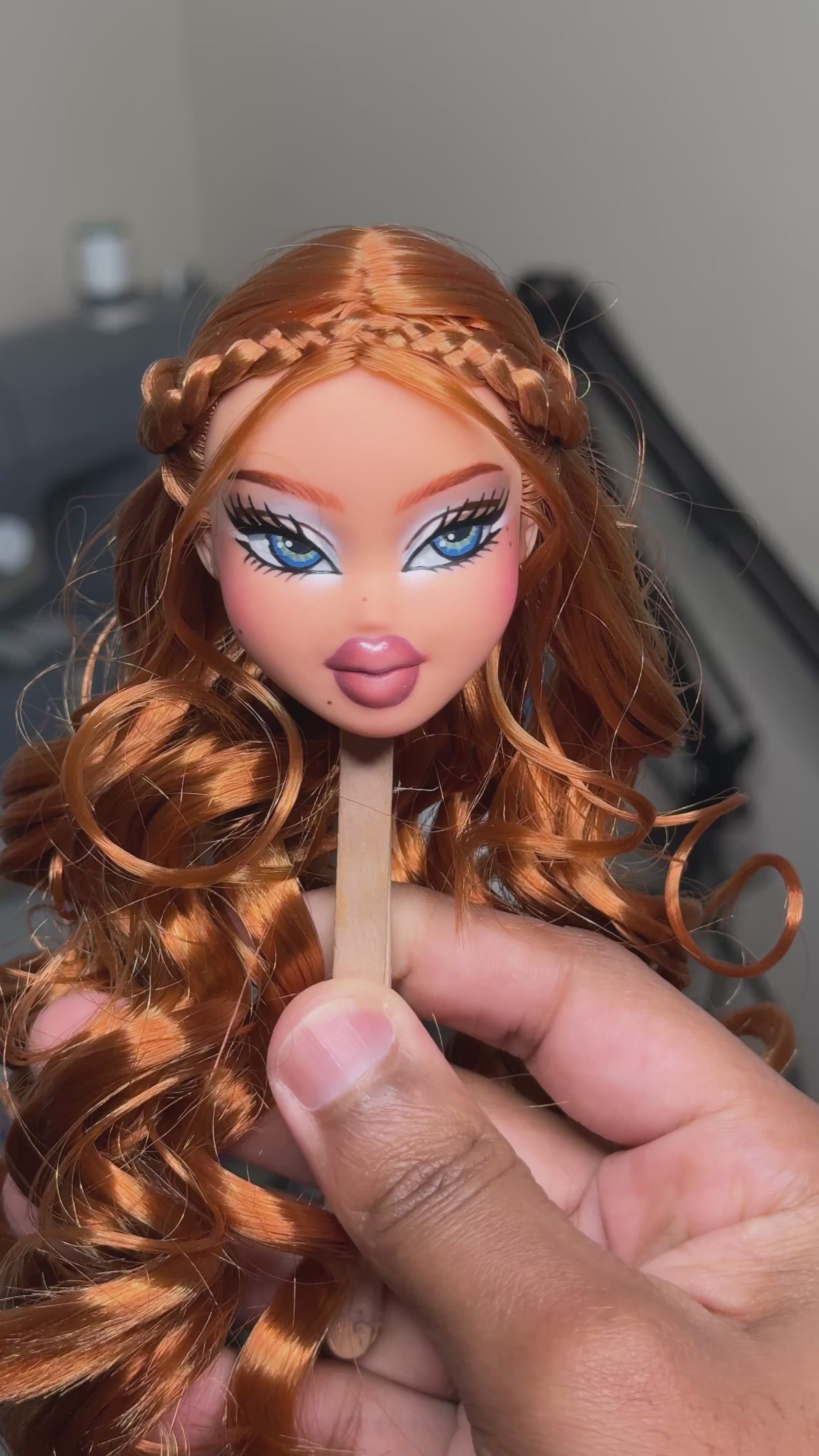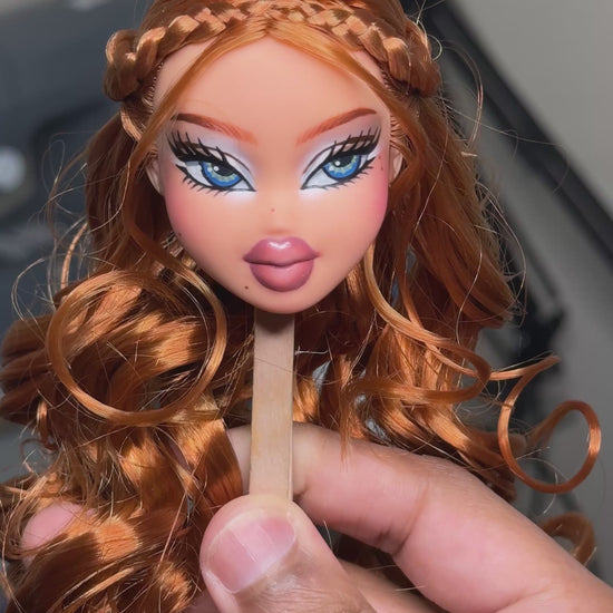 Doll has been hand painted and airbrushed with high quality acrylic paint and sealed with multiple layers of MSC sealant. Doll has nylon hair that has been cut and styled. Doll has been rooted with middle part.