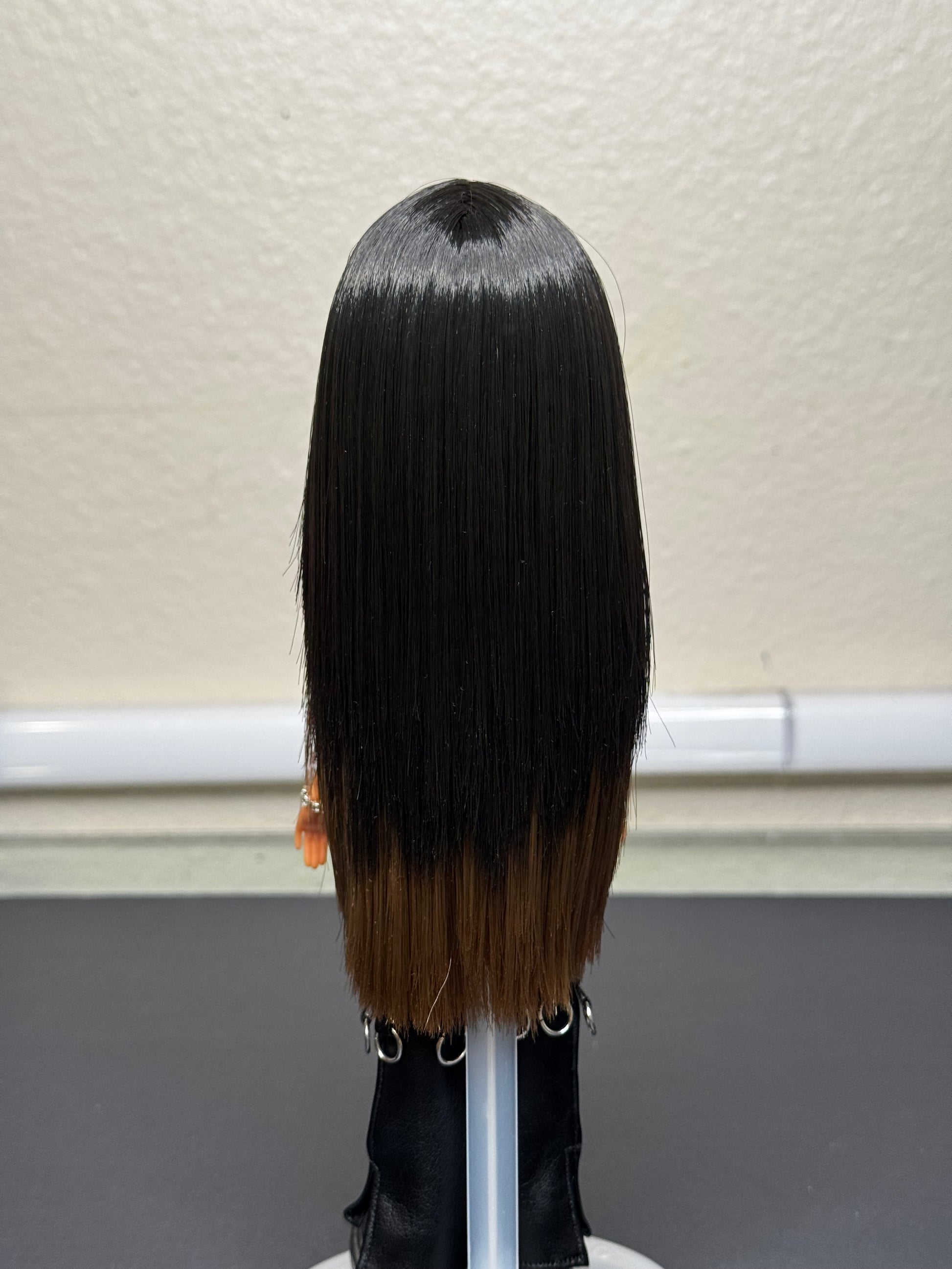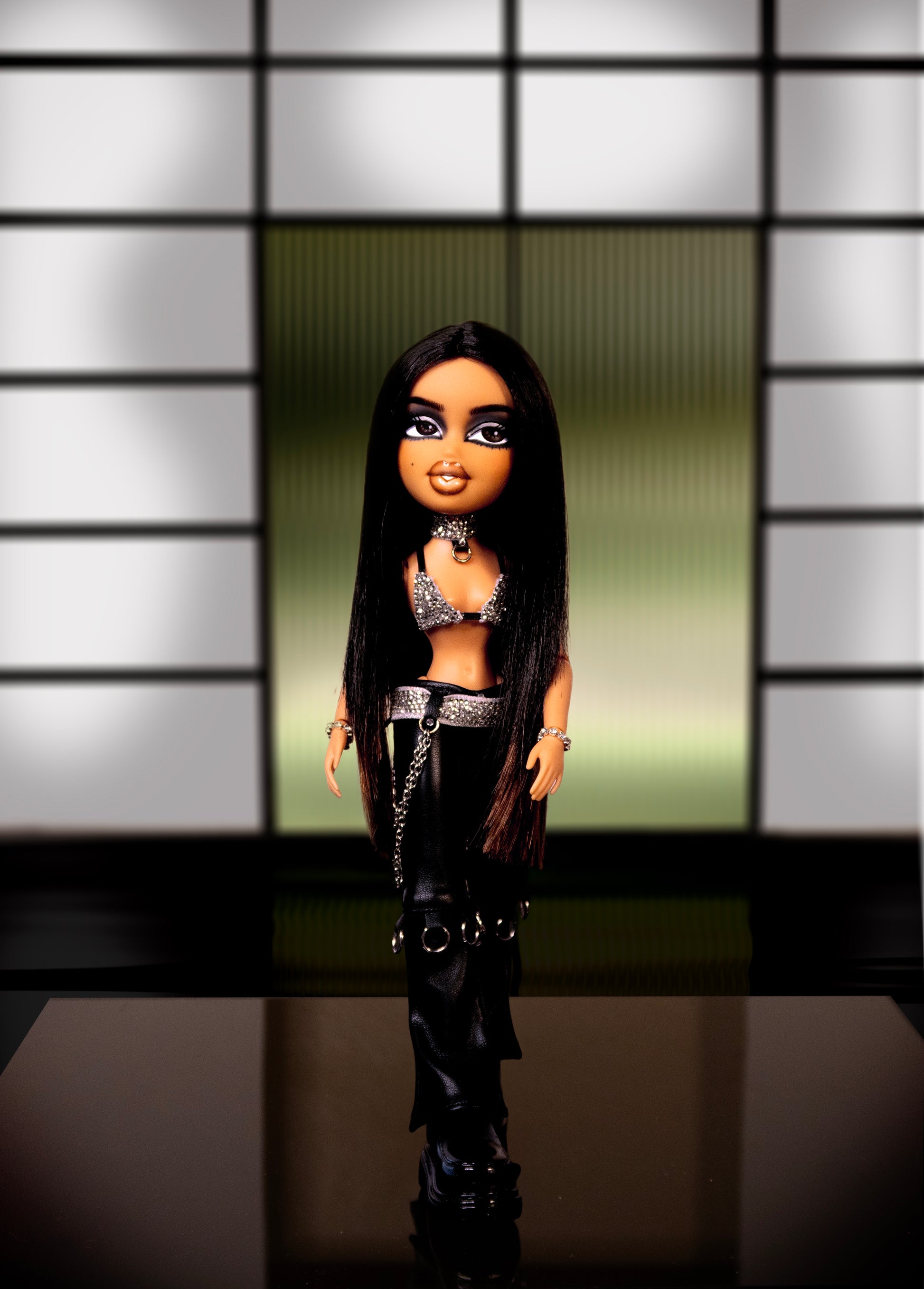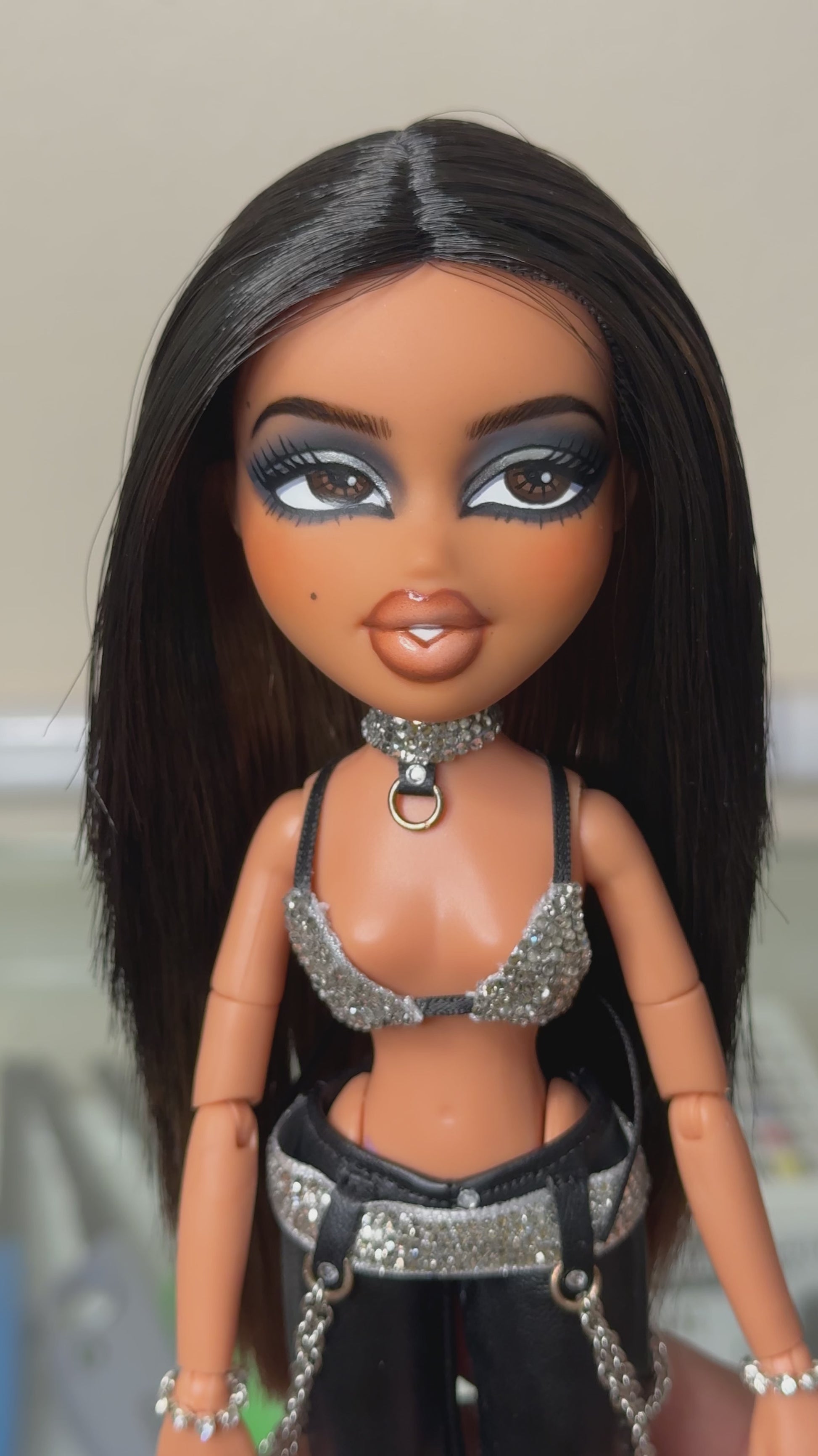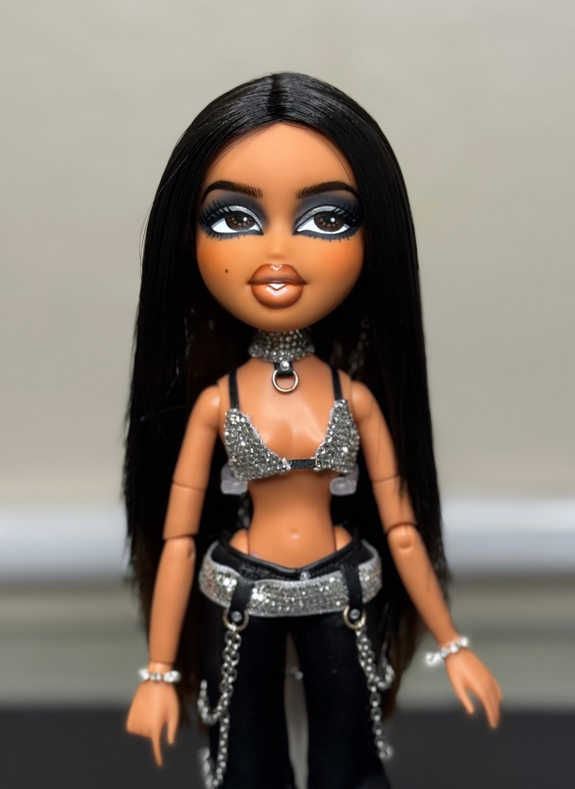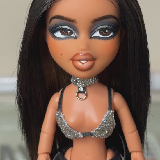 Doll has been hand painted with high quality acrylic paint and sealed with multiple layers of MSC sealant. Doll is rooted with high quality, custom, hand blended, saran hair that has been cut and styled. Custom choker, bralette and belt have been hand rhinestoned. Handle with care. The jump rings and chains are real metal and some oxidation may occur.