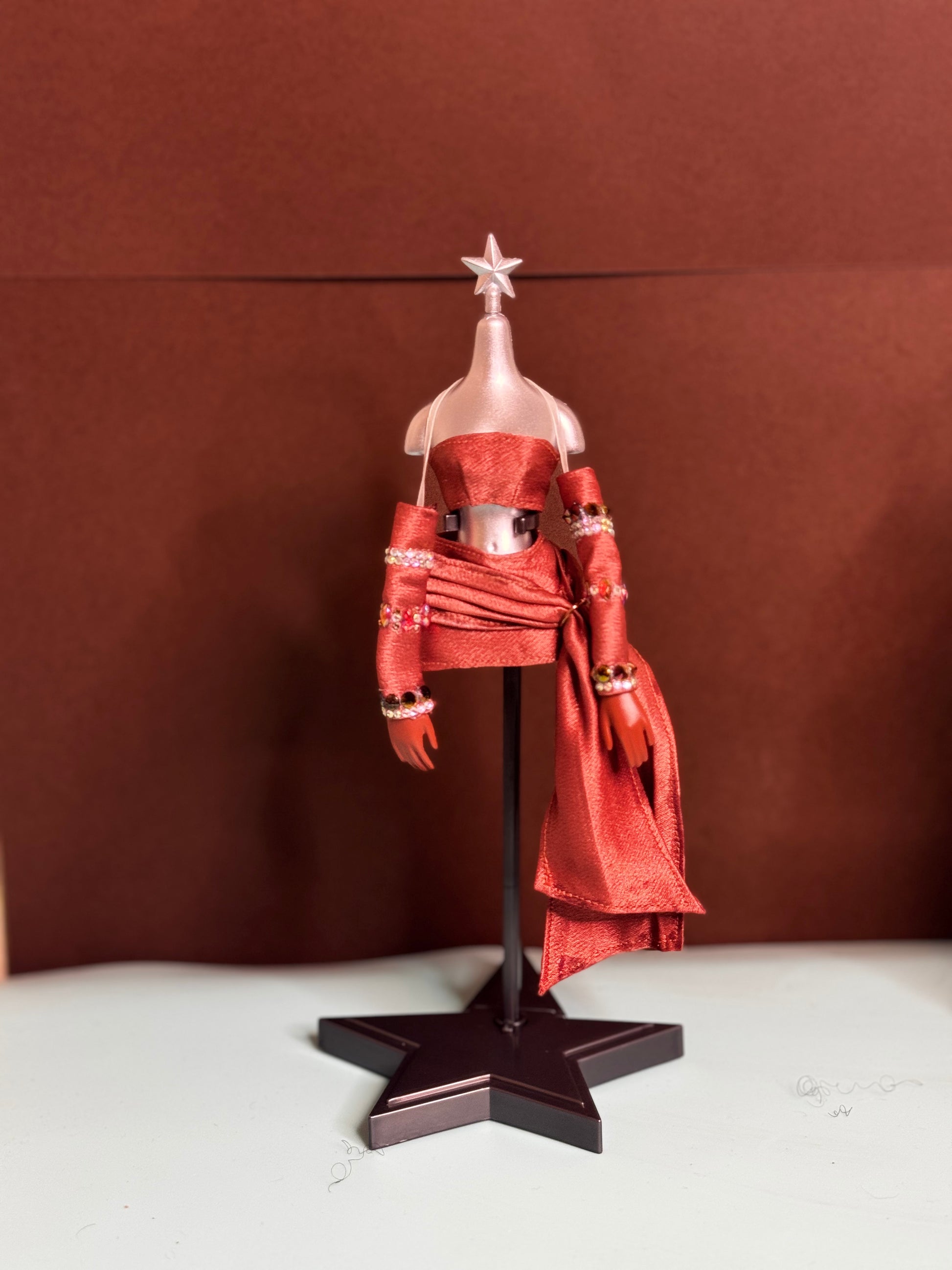 Outfit comes with bandeau top, pleated sash mini skirt, and hand rhinestoned gloves. Material is a rust colored crepe-back satin.